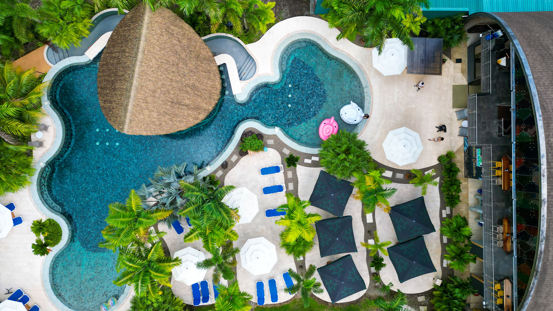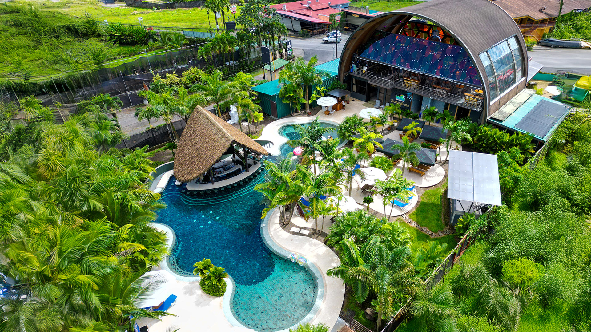 Un espacio al aire libre con camastros y jardines de palmeras, ideal para descansar, tomar el sol y compartir buenos momentos en La Fortuna de San Carlos.